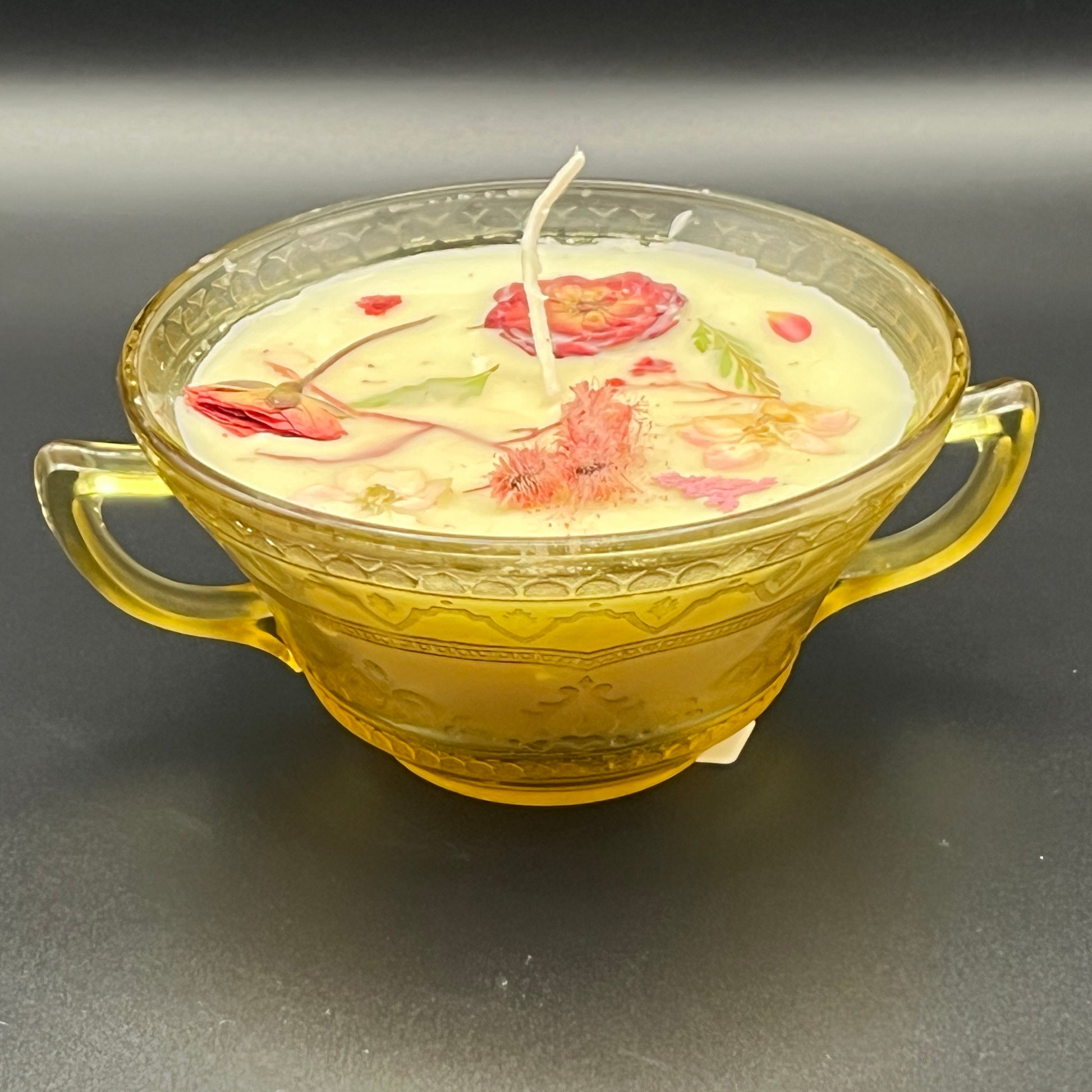 Hand-poured candle in a vintage amber double-handled glass bowl with ornate embossed detailing. The wax is finished with pressed rose-toned floral elements for a soft, romantic look. The warm amber glass enhances the glow of the flame and creates a cozy, vintage-inspired centerpiece. The vessel can be cleaned and repurposed once the candle has burned.