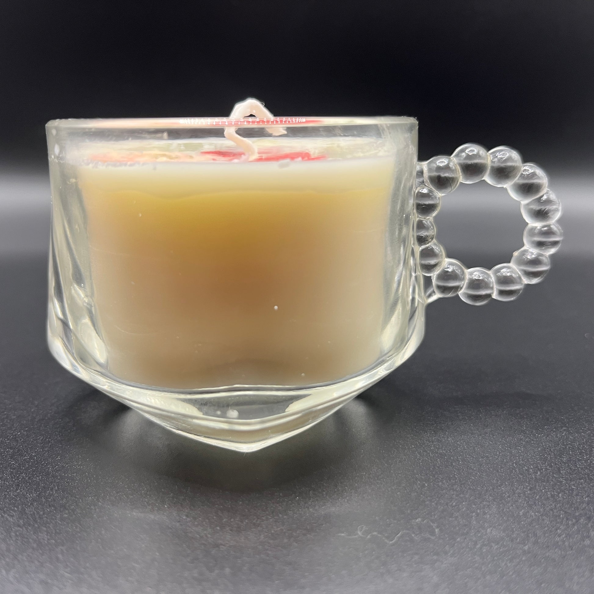 This handcrafted soy wax candle is poured into a clear glass mug featuring a rounded body and a distinctive beaded glass handle that adds texture and charm. The transparent vessel highlights the layered soy wax and soft natural color variations. The candle is topped with pressed florals in rich red and blush pink tones, complemented by pale green botanical accents. Made with soy wax for a cleaner burn and smooth finish, this candle offers both visual elegance and lasting beauty, even after the candle has burned.