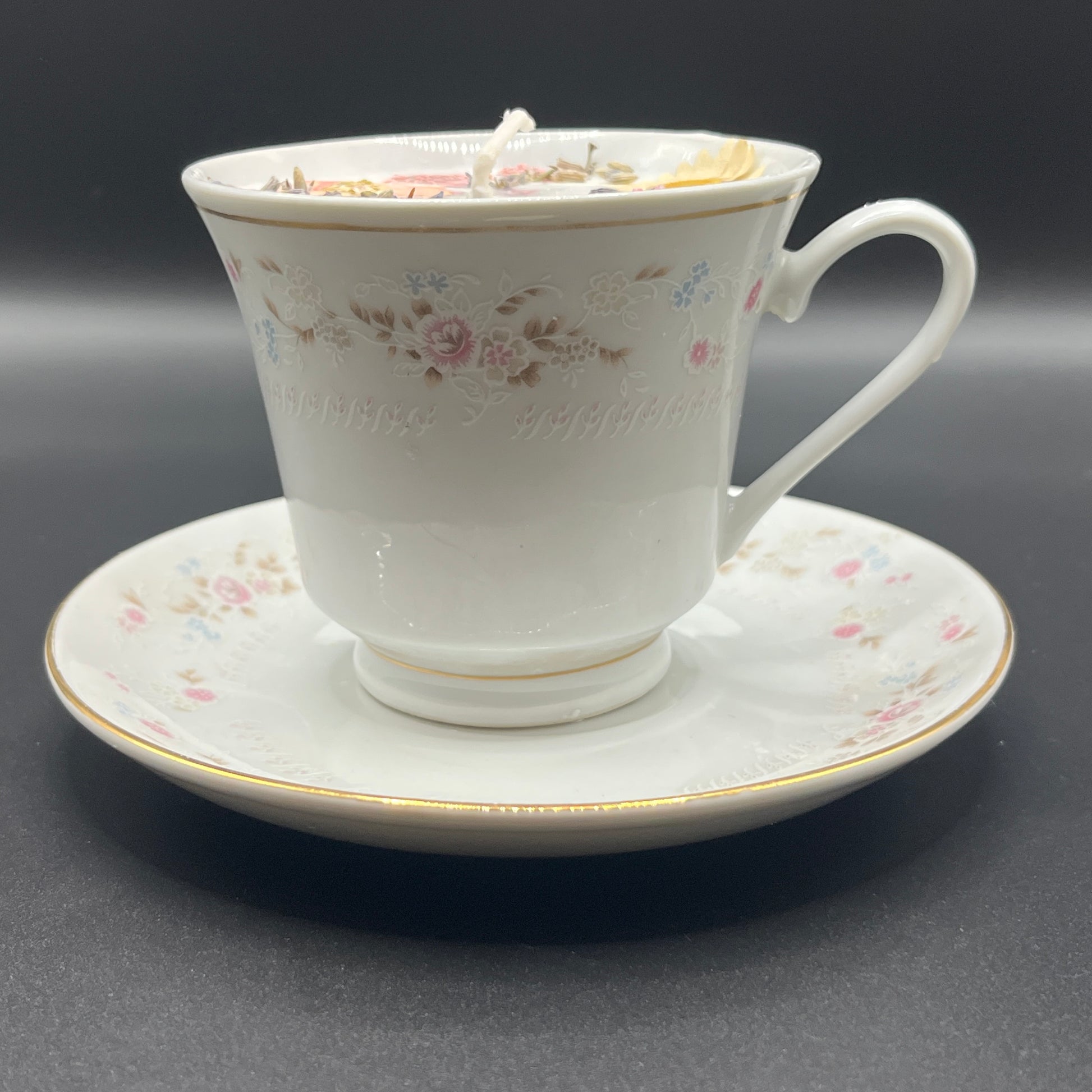 Pastel Garden Floral Soy Candle in Porcelain Teacup with Matching Saucer