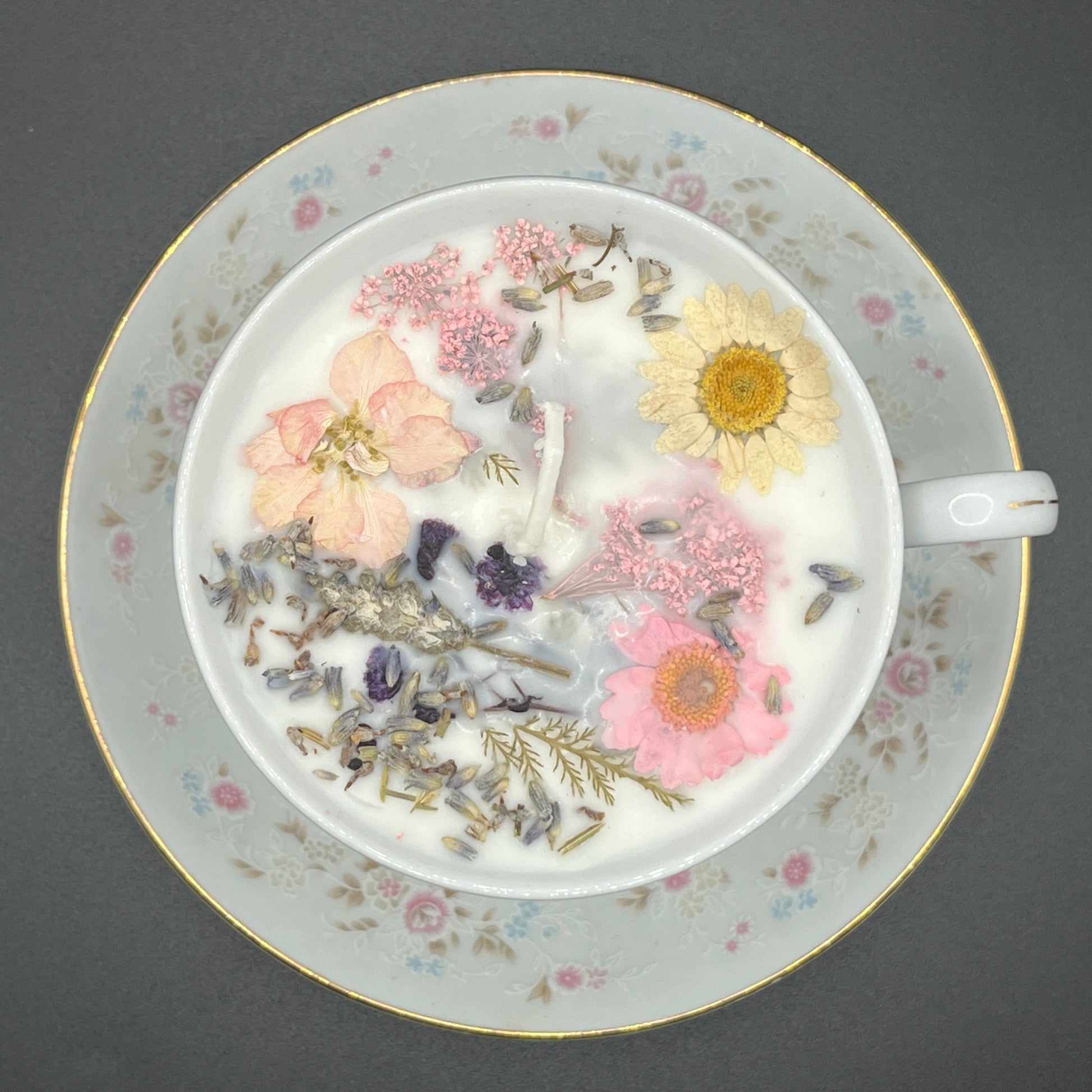This handcrafted soy wax candle is poured into a delicate white porcelain teacup paired with a matching saucer, both adorned with soft pastel floral patterns and subtle gold trim along the rim. The classic teacup shape and coordinated saucer give this piece an elegant, heirloom-inspired appearance. The white soy wax surface is decorated with pressed flowers in gentle pink, yellow, and lavender tones, along with scattered botanical elements for a garden-like finish. Made with natural soy wax for a clean, long-lasting burn, this candle is designed to be both a functional candle and a keepsake display piece.